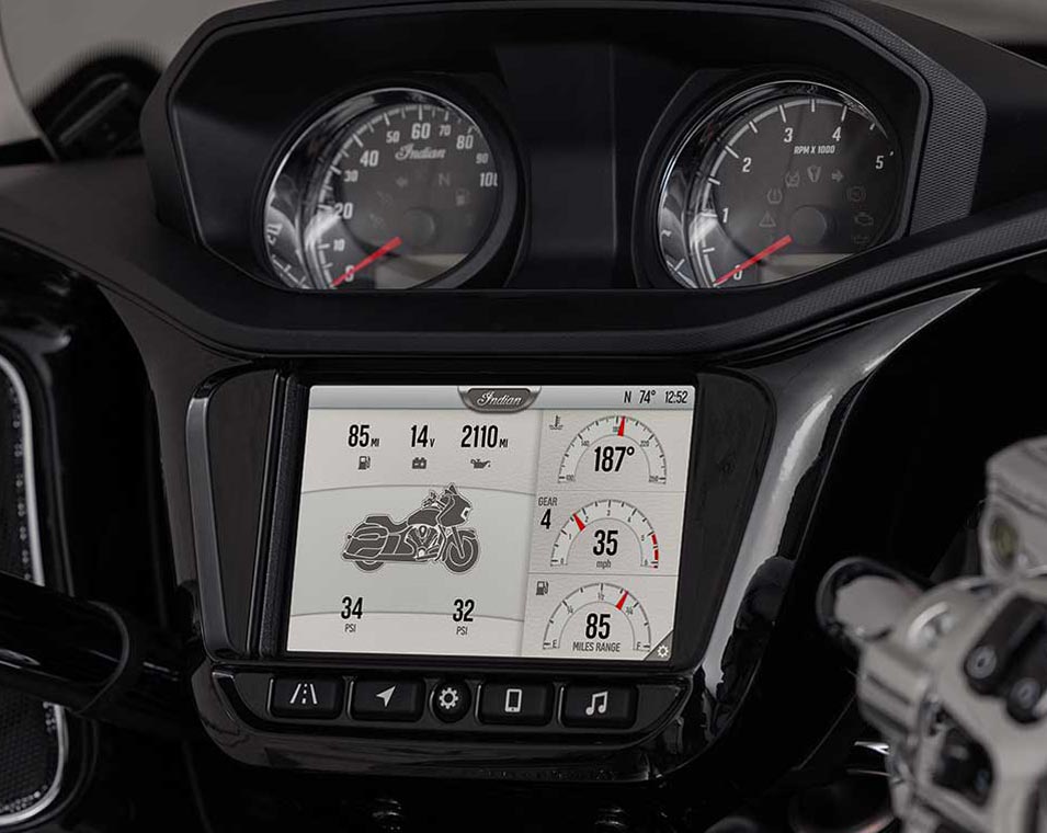 | Equipements Standard | Écran de 7 po alimenté par RIDE COMMAND avec navigation et intégration d'Apple CarPlay ; pare-brise électrique ; feux de route ; Highway Bars ; sièges en vinyle (commandes de chauffage séparées pour le conducteur et le passager) ; marchepieds passagers réglables ; rangement de 137L de stockage ; contrôle de la pression des pneus ; sacoches rigides et coffre verrouillables à distance ; modes de conduite sélectionnables ; désactivation du cylindre arrière ; ABS ; régulateur de vitesse ; démarrage sans clé ; système audio de 200 watts avec AM/FM, Bluetooth, USB, entrée compatible avec les smartphones; port de chargement 12V. |
