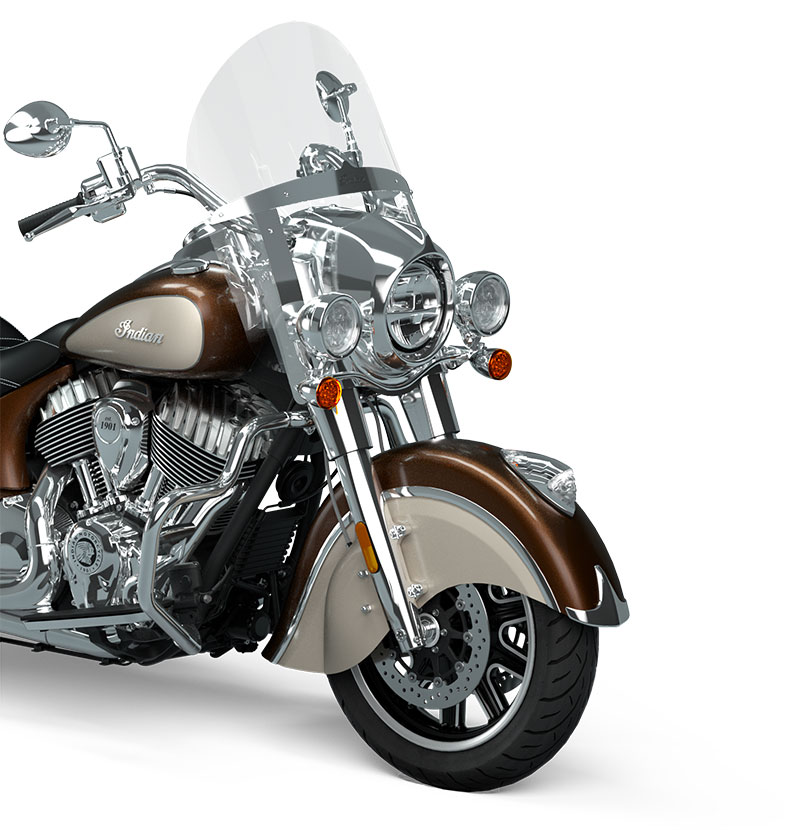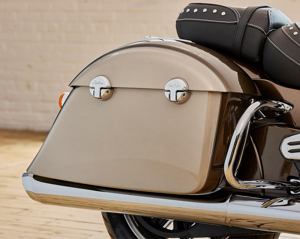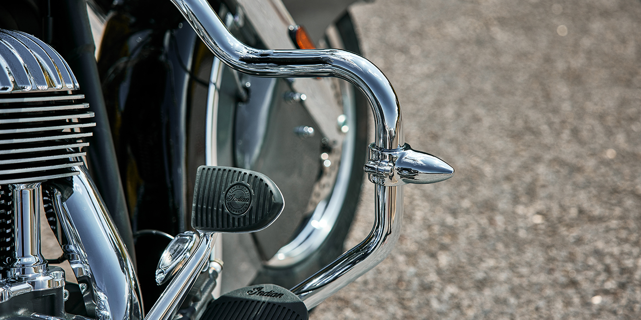 | Equipements Standard | Pare-brise à attache rapide ; selle en vinyle ; sacoches rigides à verrouillage à distance, barres d'autoroute ; surveillance de la pression des pneus ; barre lumineuse ; ABS ; régulateur de vitesse ; allumage sans clé ; badge Indian® Script Tank |